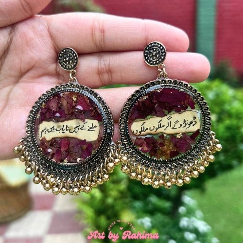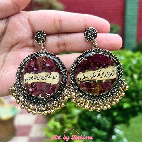 Our Aesthetic Vintage Style Jhumkas feature preserved rose petals in resin, enhanced with intricate Urdu text design for a traditional and timeless appeal.