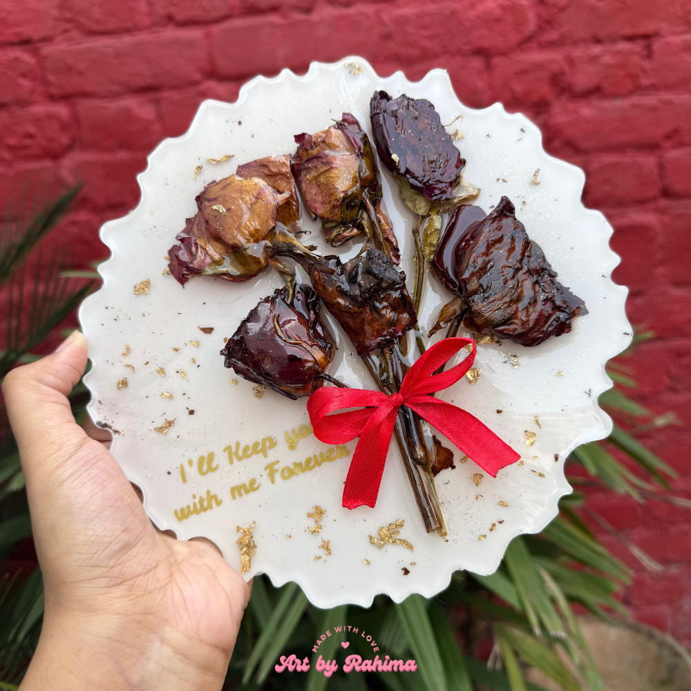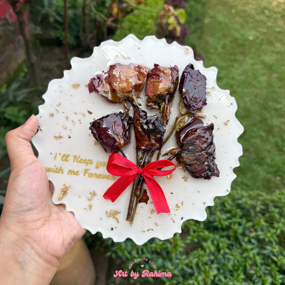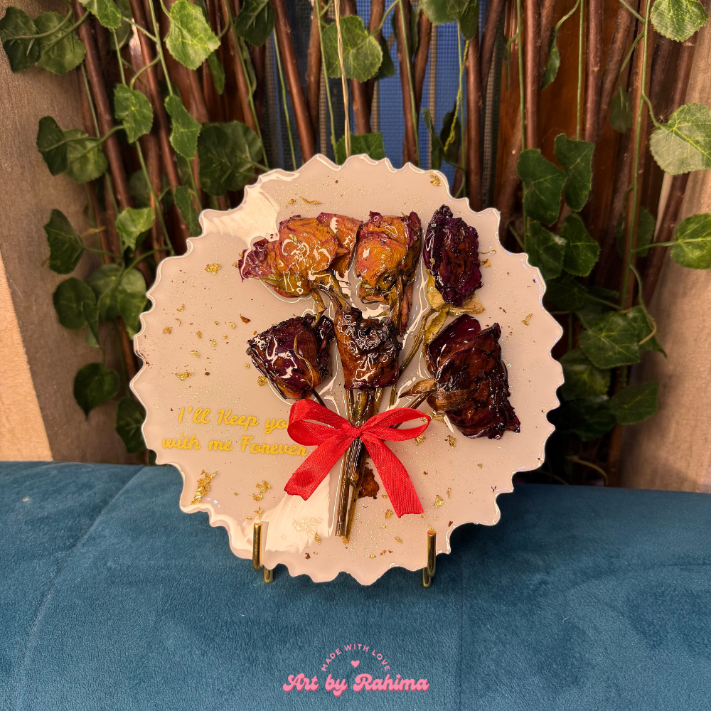 Cherish your precious memories with our Rose Bouquet Frame (8 Inch), elegantly displayed on a golden stand. This handcrafted resin frame preserves real flowers, turning them into a timeless piece of art that lasts for years.